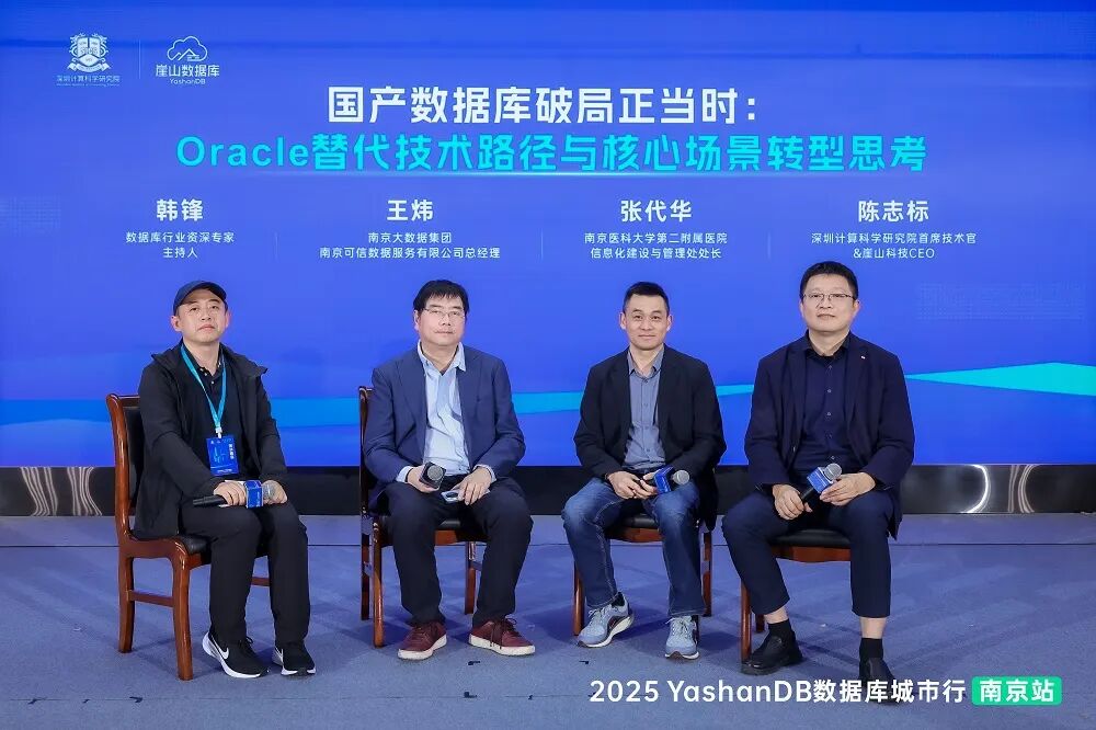除能源行业标杆案例分享外,南京站特别聚焦华东本地核心需求,围绕“国产数据库破局正当时:Oracle替代技术路径与核心场景转型思考”,邀请数据库行业资深专家韩锋主持,深算院首席技术官&崖山科技CEO陈志标、南京大数据集团南京可信数据服务有限公司总经理王炜、南京医科大学第二附属医院信息化建设与管理处处长张代华三位嘉宾展开深度圆桌对话。