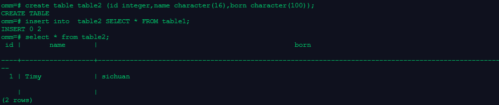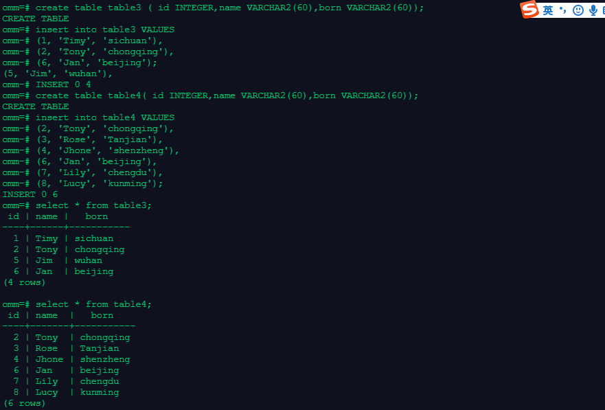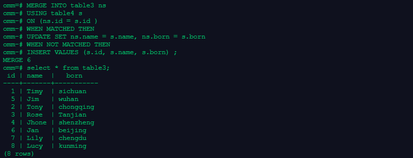 create table table3 ( id INTEGER,name VARCHAR2(60),born VARCHAR2(60)); insert into table3 VALUES (1, 'Timy', 'sichuan'), (2, 'Tony', 'chongqing'), (5, 'Jim', 'wuhan'), (6, 'Jan', 'beijing');create table table4( id INTEGER,name VARCHAR2(60),born VARCHAR2(60)); insert into table4 VALUES (2, 'Tony', 'chongqing'), (3, 'Rose', 'Tanjian'), (4, 'Jhone', 'shenzheng'), (6, 'Jan', 'beijing'), (7, 'Lily', 'chengdu'), (8, 'Lucy', 'kunming');select * from table3; select * from table4; MERGE INTO table3 ns USING table4 s ON (ns.id = s.id ) WHEN MATCHED THEN UPDATE SET ns.name = s.name, ns.born = s.born WHEN NOT MATCHED THEN INSERT VALUES (s.id, s.name, s.born) ; select * from table3;