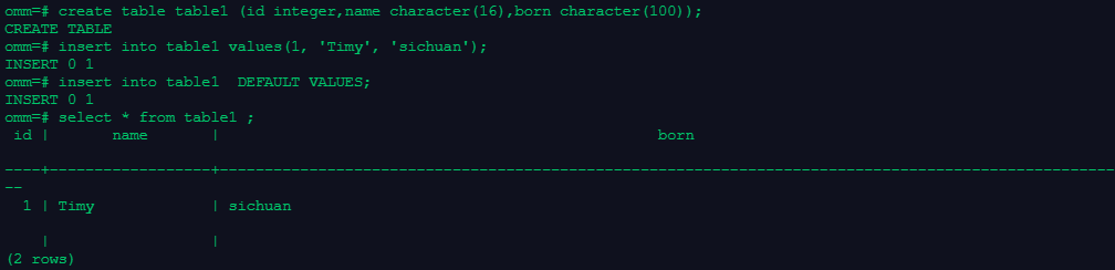 1.创建表1并在表中插入数据,分别指定字段和整行为缺省值