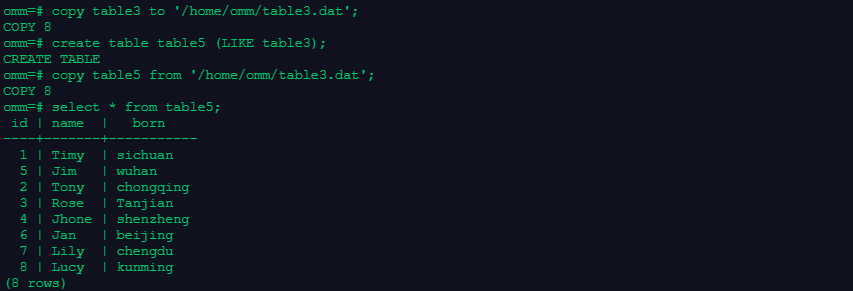 4.将表3的数据输出到文件,再将文件中的数据导入到表5