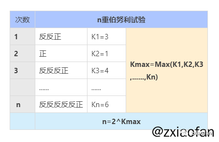 假设第1次伯努利试验抛硬币的次数为K1,第n次伯努利试验抛硬币的次数为Kn。我们记录这n次伯努利试验的最大抛硬币次数为K_max;