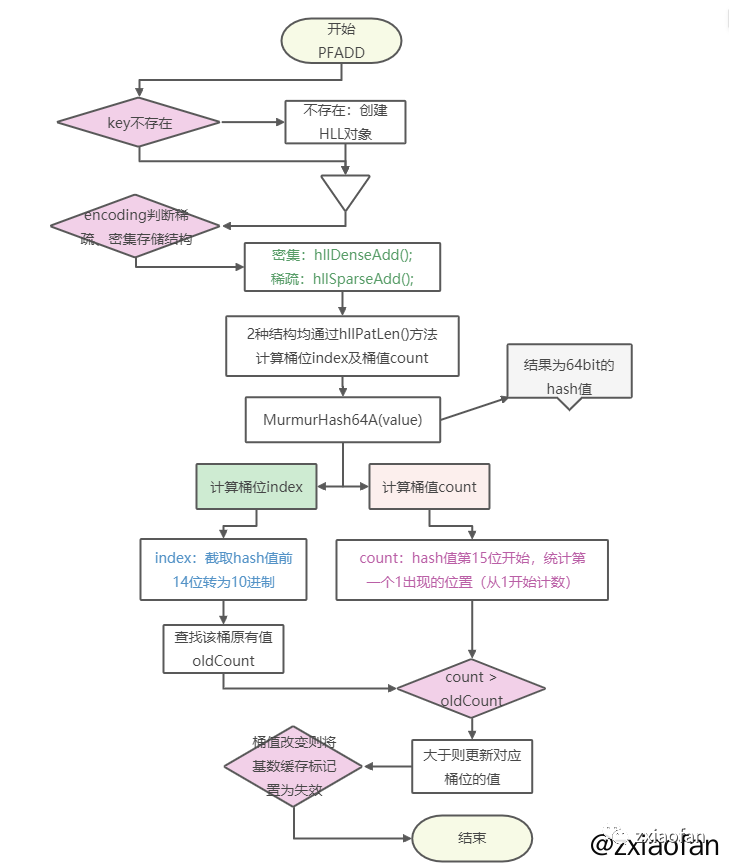 // pfcount 核心逻辑 @zxiaofanvoid pfcountCommand(client *c) {if (多key) {// 合并多个HLL后计算基数并返回(注意:不是基数值之和);}if (单key且value不存在) {// 单key且value不存在返回0;} else { // 单key且value存在if (HLL_VALID_CACHE(hdr)) {// 缓存有效// 直接返回基数缓存值;} else {// 缓存无效// 计算基数值;// 更新基数缓存标记及基数缓存值;}}}