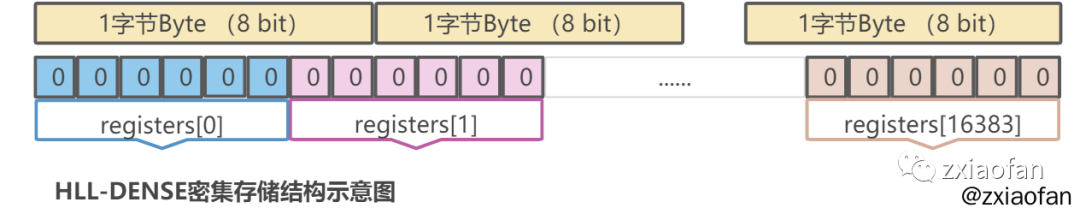 密集存储结构相对很简单,由连续的16384个寄存器(桶)拼接而成,每个桶6 bit。