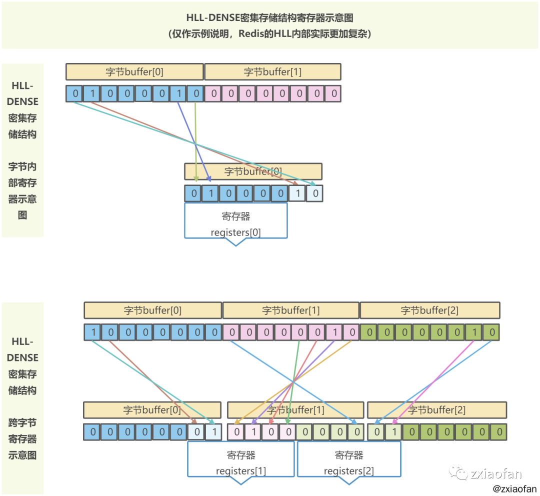 需要注意的是,HHL的字节都是左低位右高位,我们平时计算使用的字节都是左高位右低位(如二进制 0101 表示 十进制 5),所以需要倒置后进行计算。我们来个简单的图理解下,寄存器registers表示HLL的存储单元,字节buffer是底层存储结构。