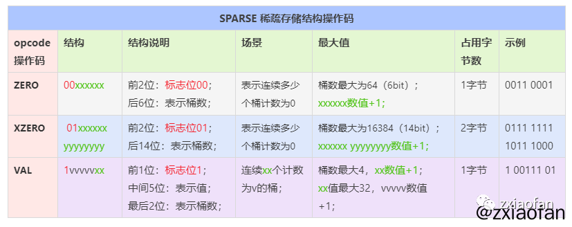 ZERO:表示连续多少个桶计数为0(桶数最大64); 前2位:标志位00; 后6位:表示桶数; 占用1字节; XZERO:表示连续多少个桶计数为0(桶数最大16384); 前2位:标志位01; 后14位:表示桶数; 占用2字节; VAL:表示连续xx个计数为v的桶; 前1位:标志位1; 中间5位:表示值; 最后2位:表示桶数; 占用1字节; 示例:1vvvvvxx,xx值最大32,vvvvv数值+1;