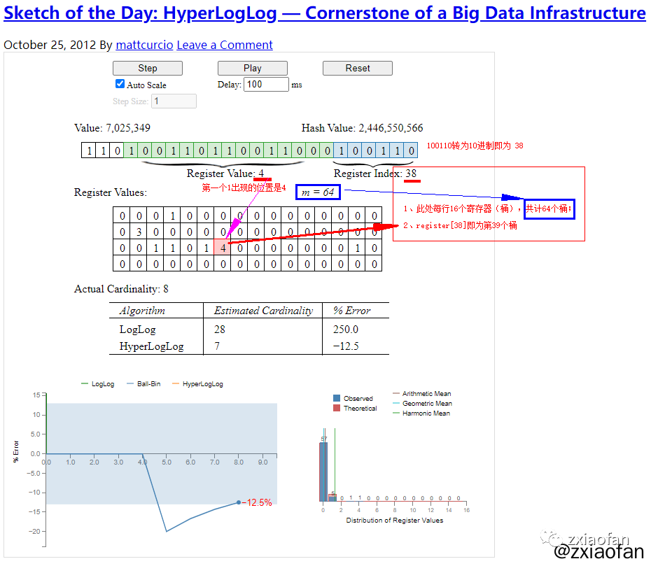 需要注意的是,此网站 value hash后的值是24位,不是HyperLogLog MurmurHash64A()后的64位,不过也不影响观察学习其原理了。