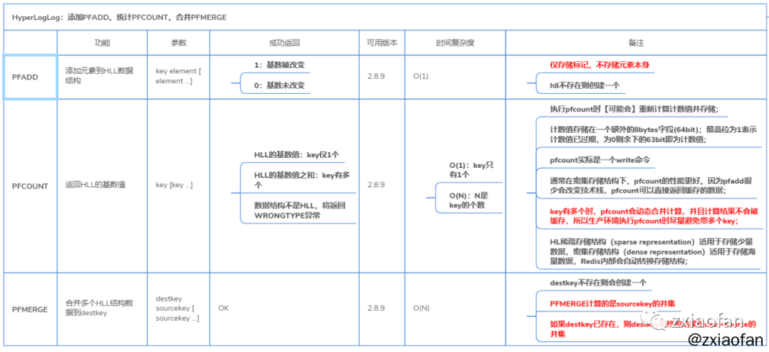 PFADD仅存储标记,不存储元素本身; PFCOUNT实际是一个write命令,执行PFCOUNT时可能会重新计算计数值并存储; key有多个时,PFCOUNT会动态合并计算(合并后再计算基数,不是计算基数后求和),并且计算结果不会被缓存,所以生产环境执行PFCOUNT时尽量避免带多个key; PFMERGE计算的是sourcekey的并集; 如果destkey已存在,则PFMERGE执行后destkey最终的结果是dest+source的并集;