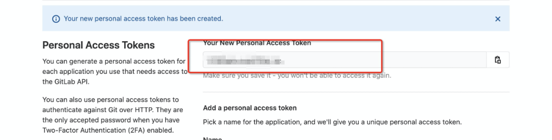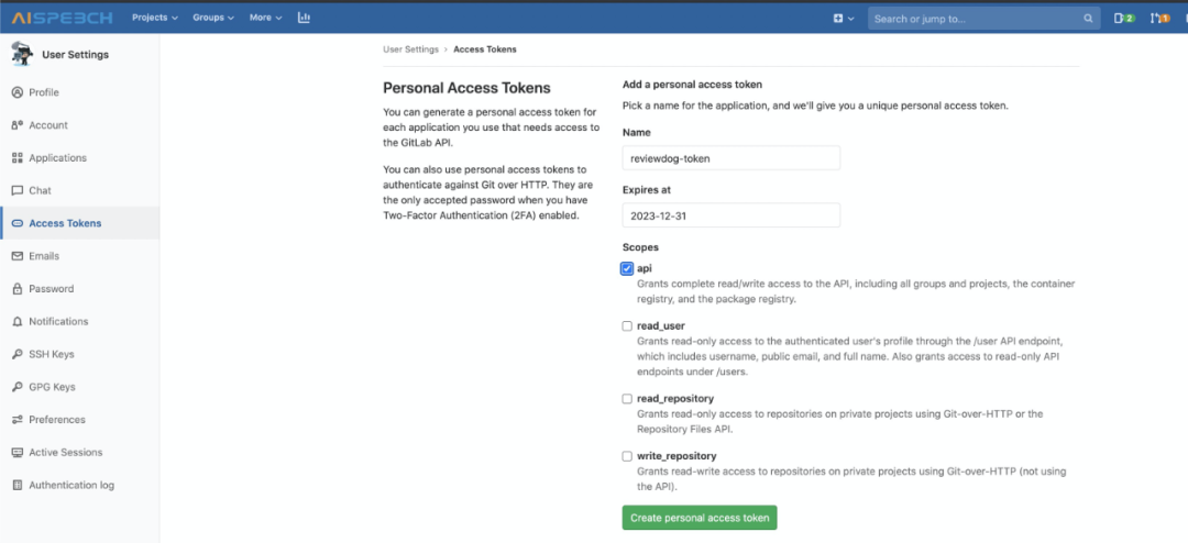 登录gitlab 点击右上角,选择 Settings → Access Tokens,填写名称和Token过期时间,Scopes里勾选api之后点击创建access token,页面会刷新,产生一个Access Token. 注意这个token需要保存好,页面刷新后就看不到了