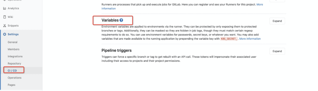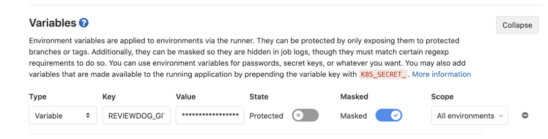 有了上面的token后, 可以在项目中添加环境变量了,打开项目主页,点击左下角Settings,展开后可以看到CI/CD子菜单(如果看不到说明权限不够,需要Maintainer角色), 点击后找到 Variables 展开,输入key为 REVIEWDOG_GITLAB_API_TOKEN, value为上面创建的ACCESS TOKEN, 记得开启Masked,防止job log里泄漏敏感数据。