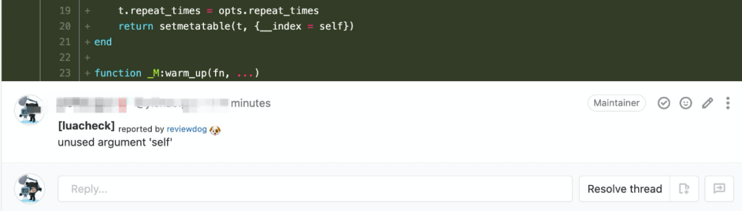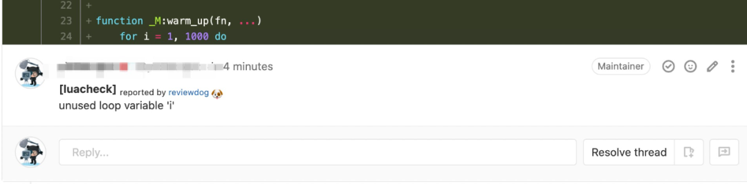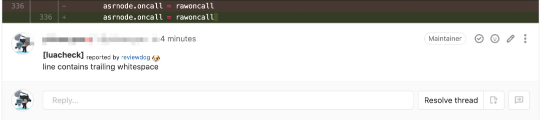 在GitLab创建了一个测试MR, 其中包含了一些luacheck可以检测出来的warning, 可以看到无论是新增的行还是修改已有的行, reviewdog 都能够正确找到warning的位置并添加上相应的评论, 最后上一下效果图。