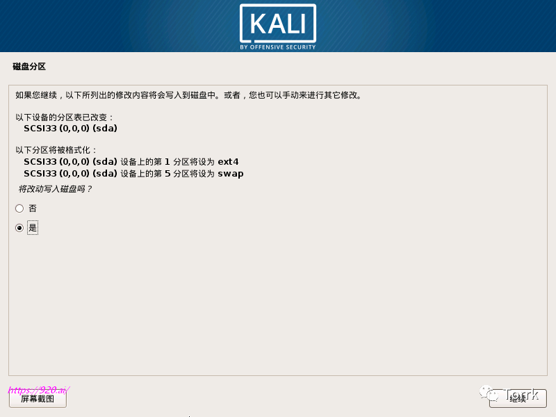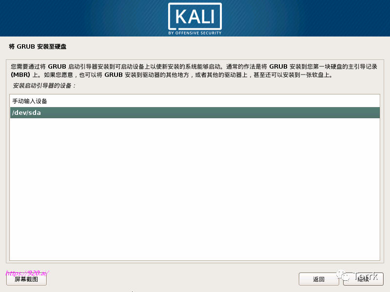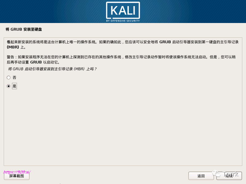 将GRUB启动引导器安装到主引导记录(MBR)上 ,选择