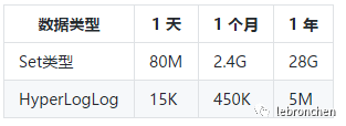 可以使用Lua脚本往HyperLogLog和Set类型中写入大量数据来检测消耗的内存大小,这里直接将网上百万级用户的测试结果展示出来: