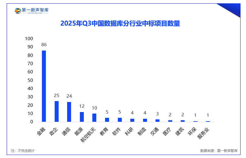 据第一新声智库不完全统计,2025年第三季度数据库公开中标项目共185个。从行业需求结构看,市场已形成清晰的梯队态势。金融行业以86个公开中标项目的绝对优势主导市场,五百万级以上大单也多集中于金融行业。如GoldenDB中标长沙银行1107万元、云南农信2687万元;TDSQL中标东莞银行总行821万元、秦皇岛银行694万元;OceanBase中标东莞银行1078万元。