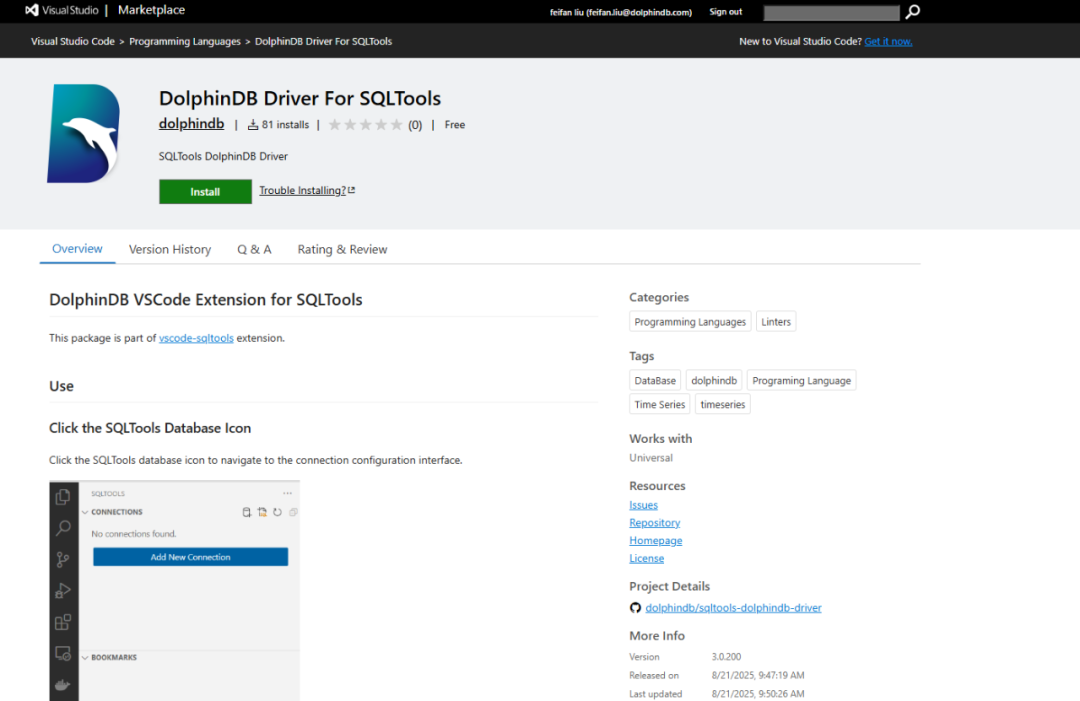 您可以在 VS Code 扩展商店中搜索 "DolphinDB Driver For SQLTools" 安装此驱动,或搜索 "DolphinDB" 获取官方插件。