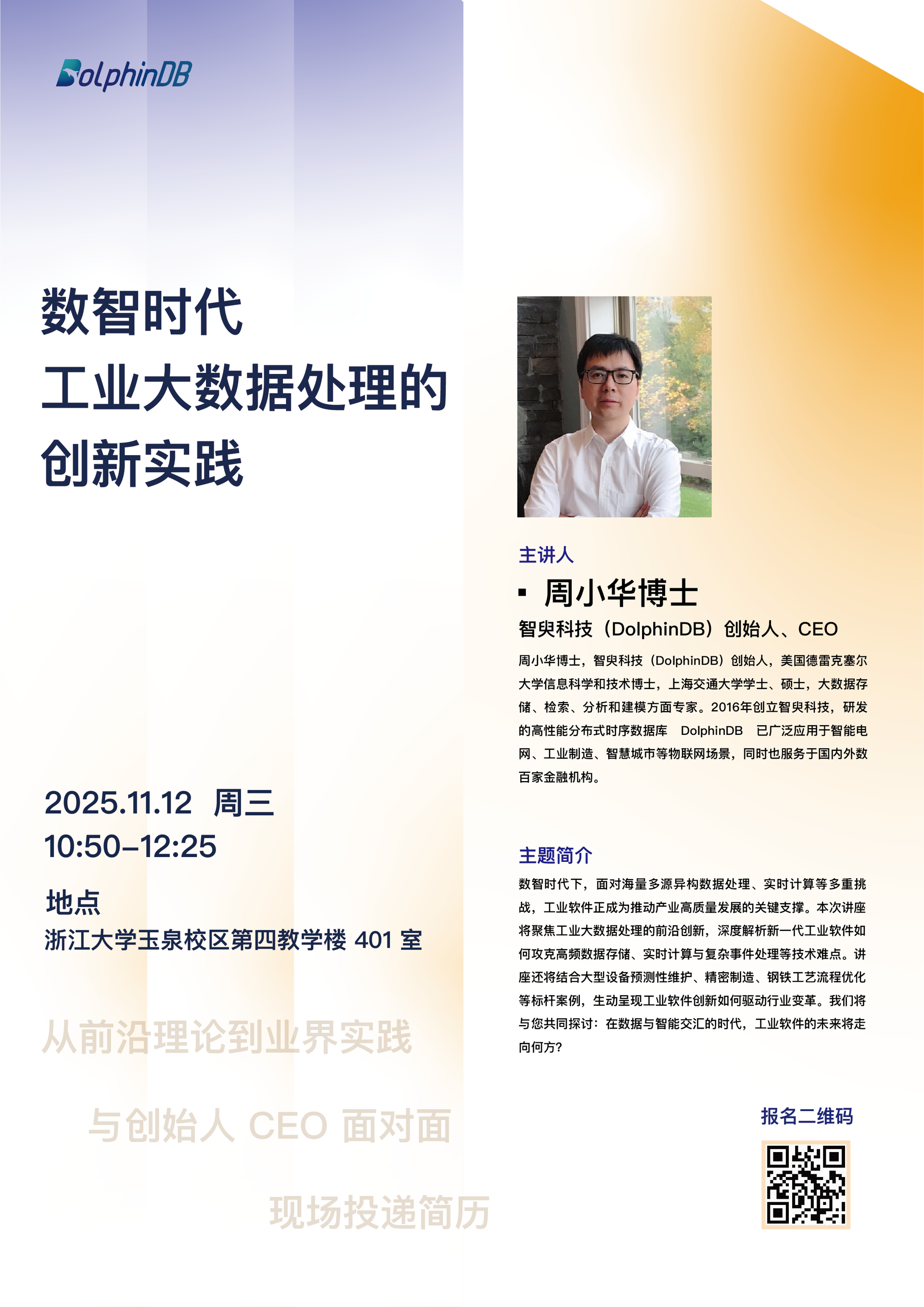 本次讲座,DolphinDB 创始人周小华博士将聚焦工业大数据处理的前沿议题,深度解析新一代工业软件的技术实现。他还将结合大型设备预测性维护等案例,展示工业软件创新如何驱动行业变革,真正成为工业智能化的引擎。