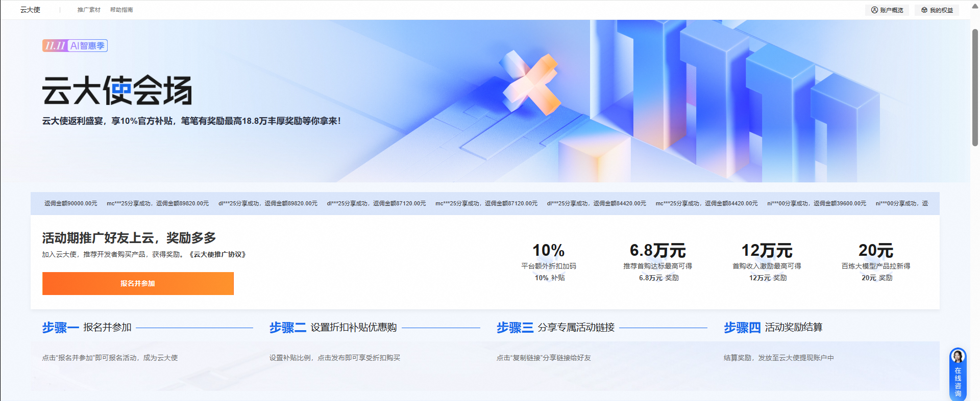 11月1日-11月30日报名活动。邀请首次购买后消耗百炼大模型产品的用户(订单实付金额≥20元,使用云大使专享红包折扣前的金额)且tokens消耗≥1w,活动奖励20元,限量发放先到先得!(详细规则查看活动处“活动规则”)