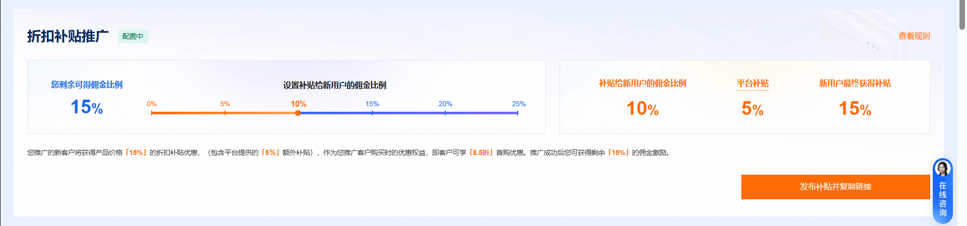 在活动期间,云大使开启折扣补贴活动,平台提升补贴折扣优惠。额外增加补贴至10%的折扣优惠,即云大使补贴给新用户的佣金比例5%+平台补贴10%,合计给新用户的补贴15%。即新用户可享受85折的优惠购买产品。同时云大使返佣于日常设置折扣补贴对比,返佣不变,用户可以享受了更优惠的折扣价格。(活动期云大使L4等级佣金让利设置,最高可设置补贴35%佣金比例,12月1日起可恢复40%的佣金比例。)
