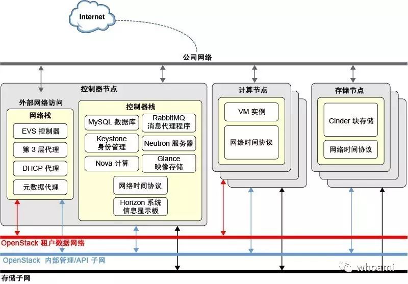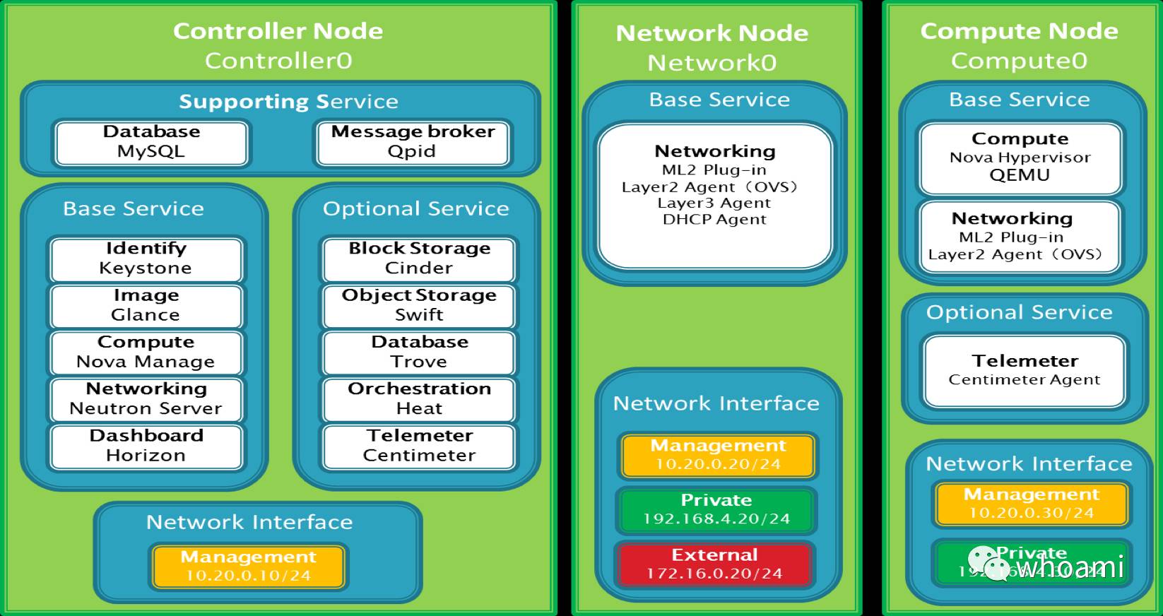 由于OpenStack的灵活性,您可以使用多种方式在多个节点或系统中分布其组件。比如:系结构仅显示一种在三个节点上部署组件的方式: