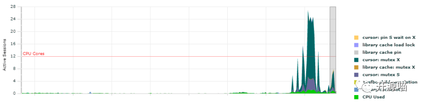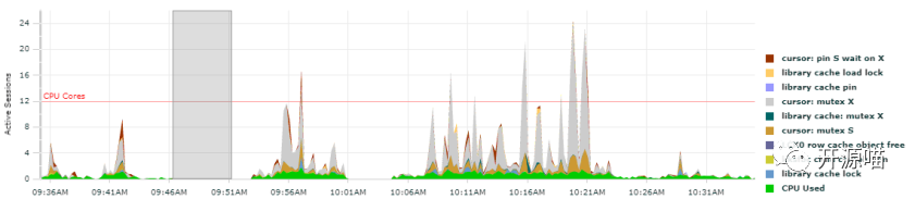 The image below shows a taste of what the OEM graph looked like on the second occurrence, but this was during a reasonably quiet period during the problem and during the most active periods the entire graph was filled with cursor mutex X and cursor mutex S.