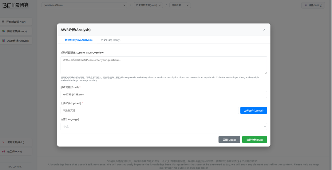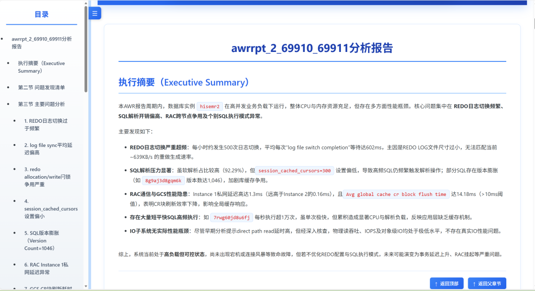在今年年初决定组建佰晟智算这家新公司的时候我就在想佰晟智算要做些什么,公司起名“智算”想要做的是基于AI的落地应用。利用AI来为数据库运维、为DBA做一些繁杂、辛苦的工作,给DBA和企业的数据库运维提供一些辅助。前些年我一直在从事数字化运维的研究工作,不过数字化的知识如何发挥作用一直是个难题,今年年初的Deepseek浪潮让我看到了一种新的可能,那就是“知识交付”。以前大家都是依托知识传递来实现知识变现,无论是付费阅读还是培训,都是如此。知识传递的过程中损耗太大,甚至有些受众无法承接传递过来的知识。还好现在有了AI技术的加持,这种情况下,无需通过知识传递去变现知识,可以在AI的帮助下直接实现知识变现,也就是利用知识构建的智能体来直接交付给用户结果,中间省略了受众接受知识、消化知识、学会利用知识的过程,变得更加直接。结果交付可能不一定能够交付最终结果,也许大部分是中间结果,不过这种中间结果交付可以让受众获益良多,比如我们周日发布的BIC-QA 1.0.7版本中的Oracle AWR智能解读工具,其解读结果不仅包含了对AWR数据理解的丰富的知识,这些知识可能很多不一定被某些DBA掌握,即使掌握了某些知识点的DBA,也很难对拥有上万个指标的报告进行精准阅读,筛选出问题点。BIC-QA可以帮你生成一份十分易读的报告,DBA结合当前系统的故障现象,就更容易定位问题了。甚至对于一些资深的Oracle专家,这个工具也是有价值的,因为它可以帮你通读所有的数据,筛选出疑点,大大节约专家的宝贵时间。目前我们也在和一些国产数据库厂商合作,首先由数据库厂商提升他们的AWR报告的质量,让他们的AWR报告也能达到类似Oracle AWR报告的效果,之后BIC-QA就会上线这些国产数据库的AWR智能分析功能。除此之外,BIC-QA今后还会演变成一个全面的DBA助手,我们会在github上开源一系列包括巡检、风险分析、故障诊断、容量预测等的数据采集工具,用于现场数据的采集。将这些采集到的数据上传到BIC-QA的服务端,会自动生成大量的AI分析报告,辅助DBA的工作。对于有安全考虑的用户,我们还会推出基于订阅许可的线下部署的商用版本,分为“DBA智能助手”和“企业智能运维助手”两种版本,其中"DBA智能助手”是个人版,可以在WINDOWS上直接部署和使用,DBA在用户现场使用开源的工具采集到数据后,将文件上传到自己笔记本电脑的服务端,就可以让AI帮你做分析处理了。订阅的价格也会十分亲民,吃顿饭的费用就可以订阅一年了。当然,对于一些希望使用免费工具的朋友,现在就可以使用我们周末发布的BIC-QA线上版了,线上版是免费的,大家只要把AWR报告或者后续通过我们的开源工具采集的数据文件上传到我们的服务端就可以享用免费的AI分析了。你们上传的AWR报告在分析结束后将会在服务端删除,我们也承诺不会将这些报告泄露给任何第三方。商用版的功能首先都会在线上版里发布。 11月9日,DBAIOps社区正式发布了BIC-QA 1.0.7版本,目前在GitEE(https://gitee.com/BIC-QA/BIC-QA)和GitHub(https://github.com/BIC-QA/BIC-QA), 上都可以直接下载浏览器插件,尝鲜新功能了。 BIC-QA 1.0.7版本最重要的功能更新是新增了Oracle AWR报告的智能解析功能,支持从Oracle 10g到最新的26ai的AWR报告的分析功能。用户只要上传HTML格式的AWR报告,DBAIOps社区的后端服务就会自动分析这份报告,并且把分析后生成的结果通过您注册的邮箱发送给您。因为分析报告需要大语言模型接入,而且要对AWR数据做全面的解析(针对12c之后的报告,其中的ASH数据也会同时被分析),因此分析时间超过10分钟,如果同时分析的报告数量较多,上传后15-30分钟可能才能收到结果邮件。 操作十分简单,如果插件已经配置好(对于1.0.6版本的用户,只需要把1.0.7的包解压后覆盖到原来的安装位置,所有的配置参数都会保留,如果想新装一个插件,装好后,在设置里找回原来的API KEY就可以了,无需重新注册,注册的API KEY也可以在多个浏览器中使用)。新用户先在配置界面中申请API KEY,收到邮件后将API KEY填写完毕就可以使用AWR智能解析功能了。如果你想使用知识问答的功能,还需要配置一个本地大模型(如果本地没有部署大模型,可以使用公有云的API KEY)。 完成配置后,只需要点击左侧的“AWR分析”按钮就可以如上图一样上传AWR报告,然后就静待结果发送到你的邮箱里了。上面对话框里的邮箱默认是你注册API KEY的邮箱,不过您也可以修改邮箱,让分析结果发送到希望发送的邮箱里。 系统问题概述是对DBA目前遇到的问题的描述,如果您能够很清晰地描述需要分析的问题,那么这个提示对于聚焦分析结果是有帮助的,如果不是很确定是否存在某个问题,建议不要输入这个信息,因为错误的描述会错误引导分析方向,得到错误的结论。 诊断报告左侧有个导航栏,可以让DBA比较方便地阅读报告。AWR报告智能分析工具就像给DBA配了一个助手一样,帮DBA全面地分析报告,让您不需要花太多的时间去全面分析报告,利用智能分析的结果,您可以比较轻松地定位AWR中的问题,甚至可以把这份报告转为WORD格式,作为工作成果,放到您的汇报材料里。 AI目前最好的应用就是帮助我们做一些繁琐的工作,未来BIC-QA里也会不断丰富这方面的功能。您希望BIC-QA提供什么新功能,可以在GITHUB或者GITEE上给我们留言。希望BIC-QA能给您的DBA工作带来方便。
