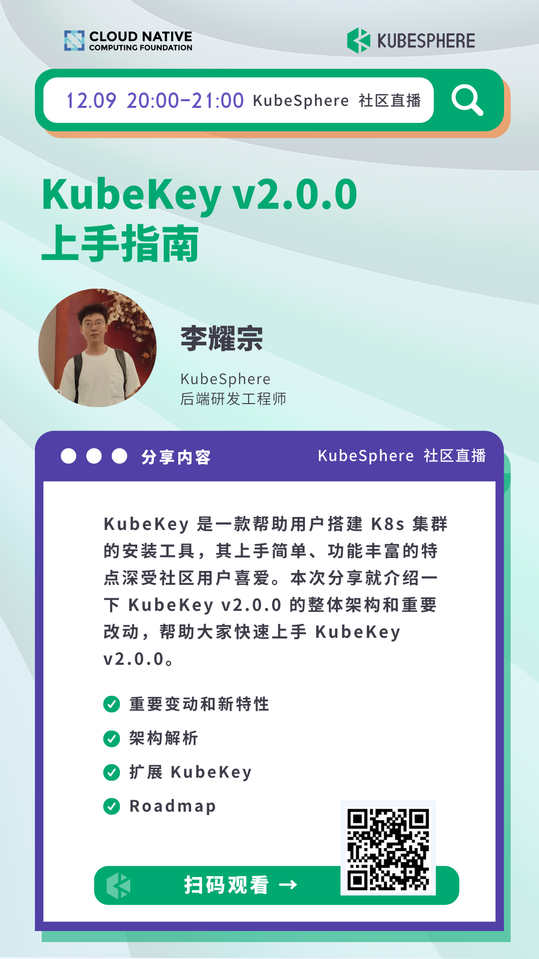 KubeKey 是一款帮助用户搭建 Kubernetes 集群的安装工具,其上手简单、功能丰富的特点深受社区用户喜爱。前段时间 KubeKey 公布了开发 v2.0.0 版本的计划,在经过几个月的开发工作后,最近代码已经合并到了残酷的主分支,并且发布了 alpha 版本。本次分享就给大家介绍一下 KubeKey v2.0.0 的整体架构和重要改动,帮助大家快速上手 KubeKey v2.0.0。