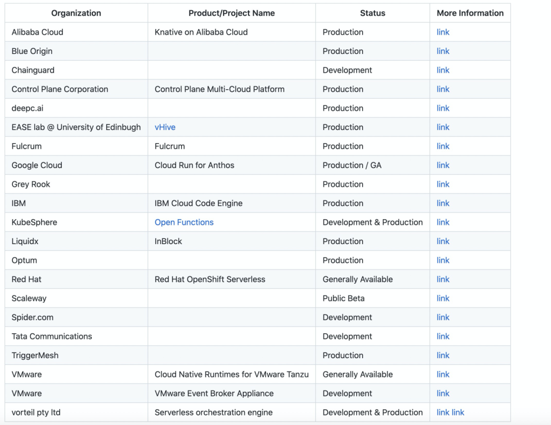 另外 Knative 社区近期也发起了一项统计:当前哪些云厂商或企业在提供或者使用 Knative。目前已统计如下(并且这项列表还在持续更新中):