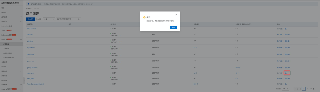 说明:阿里云 ARMS 探针版本容器服务应用 / EDAS 应用等自动升级场景 >=2.7.1.2,其他场景(手动升级)>=2.7.1.3。应用首次开启接入ARMS应用安全,需要重启应用实例。