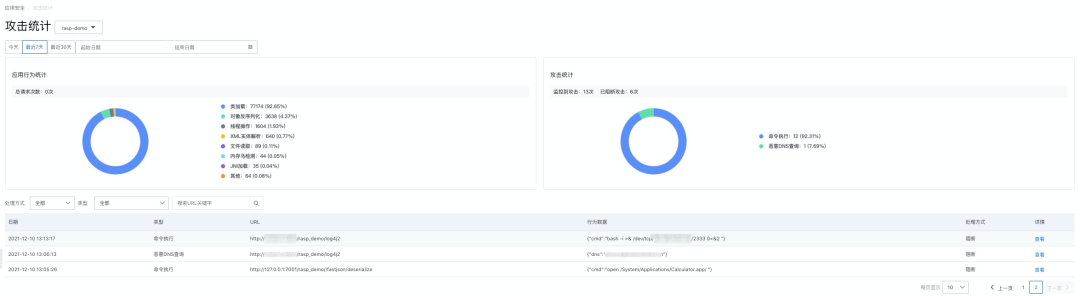 此次 Log4j2 漏洞,作为一款日志框架,相比起记录日志等类型的正常行为,进行命令注入、执行,本身就是明显异常行为。RASP 在默认规则下,会拦截掉所有因反序列、JNDI 注入导致的命令执行、任意文件读取、恶意文件上传等危险行为。不同于传统基于流量特征的防御方式,RASP(Runtime Application Self-Protection)基于行为和应用运行时上下文,不会陷入特征穷举并更加关注「正常基线」。即应用的正常使用行为有哪些,如果这个行为(如命令执行)不属于该功能的正常操作,则会进行拦截。此次漏洞,系 Log4j2 的 JNDI 功能造成的命令执行漏洞,处在 RASP 覆盖场景之中,无需新增规则也能默认防御。因此,ARMS 应用安全基于阿里云 RASP 技术针对上述漏洞进行攻击防护。