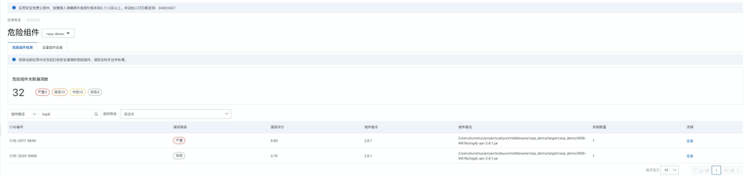 当受到 Log4j2 远程代码执行漏洞攻击时,ARMS 应用安全会识别上报攻击行为事件。还可通过配置告警规则,通过短信、钉钉、邮件等渠道接收攻击告警通知。默认防护模式为监控模式,建议观察一段时间后调整防护设置为监控并阻断,一旦发生攻击行为可以直接阻断,保障应用安全运行。3、在左侧导航栏,选择应用安全 > 危险组件检测,针对三方组件以来自动分析关联 CVE 漏洞库并提供修复建议