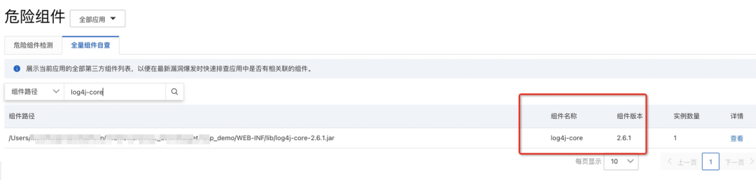 4、危险组件全量自查,通过搜索查看所有接入应用是否包含 Log4j 组件,并确定组件版本