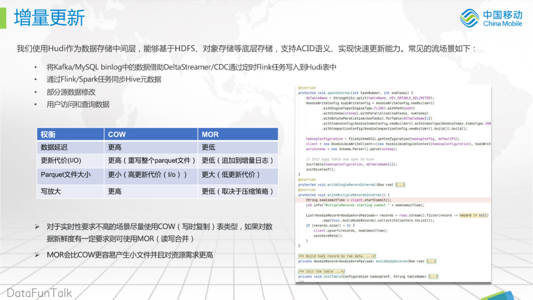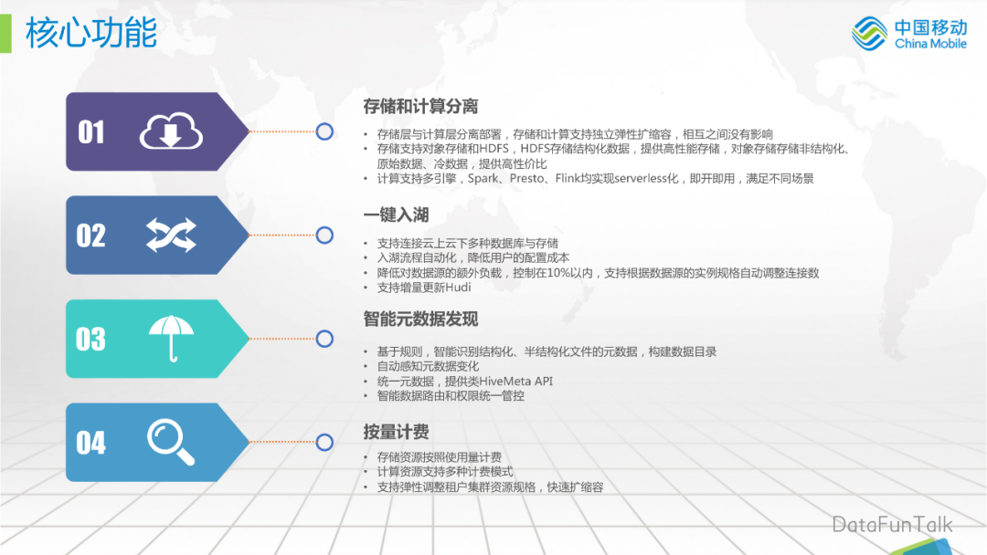 数据存储(数据湖):我们内置了HDFS和移动云的EOS,借助Hudi实现Upsert能力,达到近实时的增量更新,我们还适当地引入Alluxio,进行数据缓存,来达到数据分析的SQL查询加速能力。