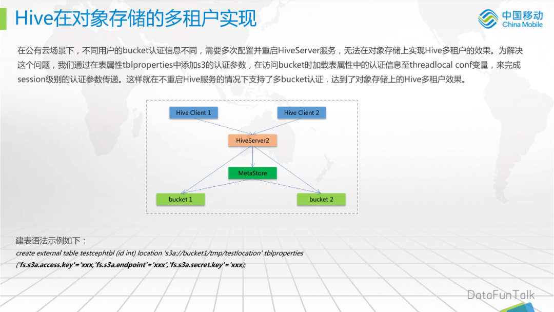 在公有云场景下,不同用户的bucket认证信息不同,需要多次配置并重启HiveServer服务,无法在对象存储上实现Hive多租户的效果。为解决这个问题,我们通过修改Hive源码在表属性tblproperties中添加s3的认证参数,在访问bucket时加载表属性中的认证信息至threadlocal conf变量,来完成session级别的认证参数传递。这样就在不重启Hive服务的情况下支持了多bucket认证,达到了对象存储上的Hive多租户效果。