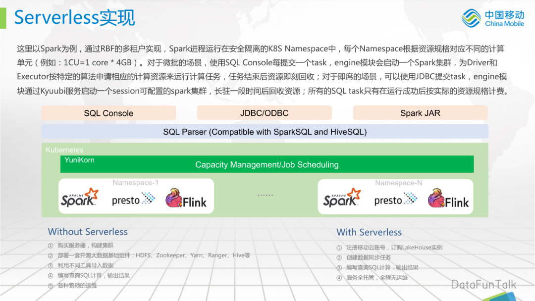 这里以Spark为例,通过RBF的多租户实现,Spark进程运行在安全隔离的K8S Namespace中,每个Namespace根据资源规格对应不同的计算单元(例如:1CU=1 core * 4GB)。对于微批的场景,使用SQL Console每提交一个task,engine模块会启动一个Spark集群,为Driver和Executor按特定的算法申请相应的计算资源来运行计算任务,任务结束后资源即刻回收;对于即席ad-hoc的场景,可以使用JDBC提交task,engine模块通过Kyuubi服务启动一个session可配置的spark集群,长驻一段时间后回收资源;所有的SQL task只有在运行成功后按实际的资源规格计费,如果不使用是不收费的。