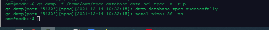 gs_dump -f /home/omm/tpcc_database_data.sql tpcc -a -F p