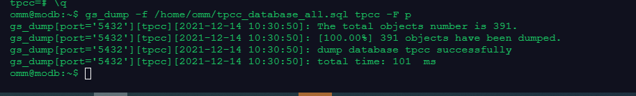 gs_dump -f /home/omm/tpcc_database_all.sql tpcc -F p