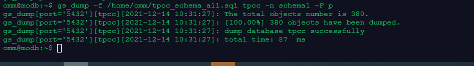 gs_dump -f /home/omm/tpcc_schema_all.sql tpcc -n schema1 -F p