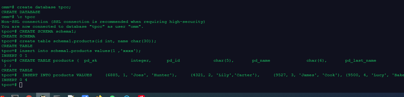 1.创建数据库tpcc,在数据库tpcc中创建模式schema1,在模式schema1中建表products