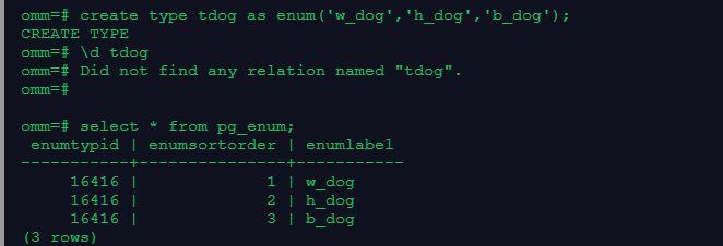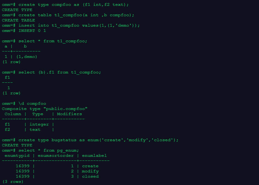 CREATE TYPE bugstatus AS ENUM ('create', 'modify', 'closed');创建一个枚举类型。