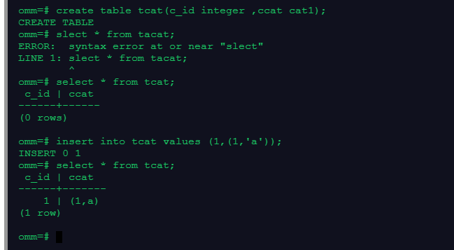 CREATE TABLE t1_compfoo(a int, b compfoo);使用compfoo类型 创建一个表。