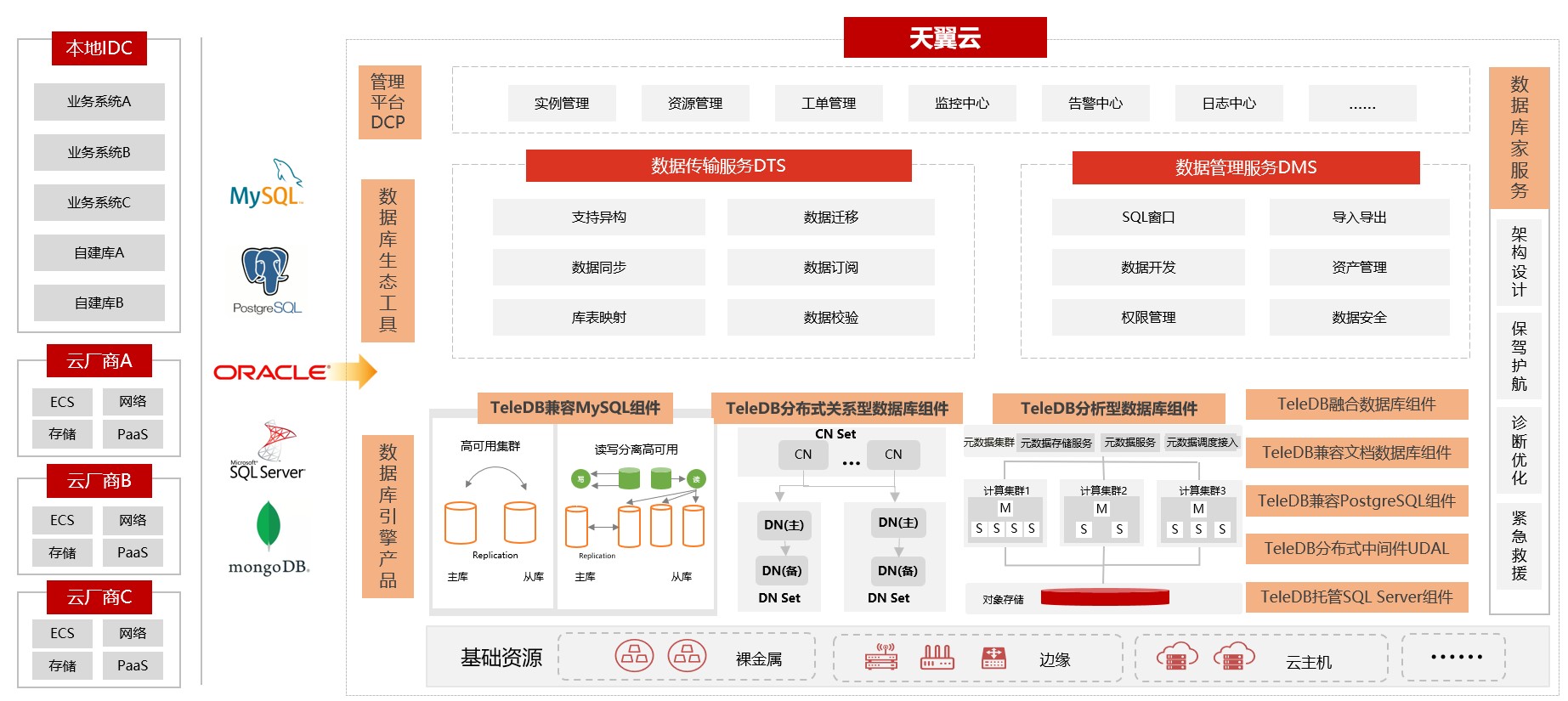 天翼云数据库 TeleDB 提供自研或开源增强内核的数据库产品,包括集中式、分布式的关系型数据库,NoSQL,分析型等多种类型数据库,提供数据传输、智能数据管理等数据库上下游生态工具。支持公有云、私有云、纯软件部署等多种交付形态,安全可靠、性能优秀、支持运营商级高可用。
