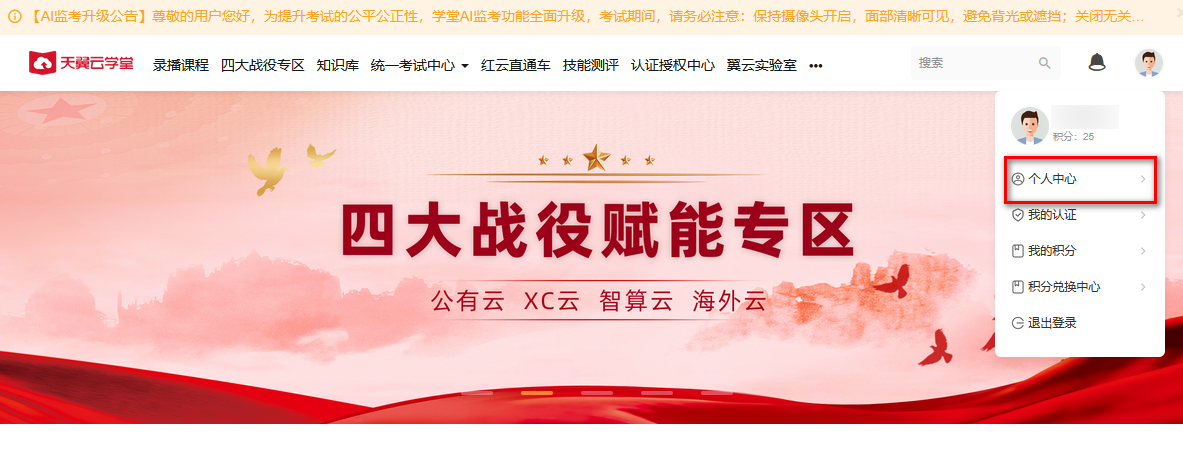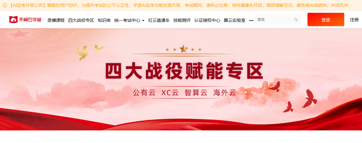 使用谷歌浏览器,输入天翼云学堂网址 edu.ctyun.cn 进入天翼云学堂登录页面,无账号用户需先完成账号注册;(注意:非内部员工没有天翼云官网账号需要先通过右上角注册按钮进行天翼云官网账号注册,完成天翼云官网账号注册之后务必在天翼云官网账号中心-实名认证处完成实名,否则将无法预约学堂认证考试,以及影响证书姓名展示,已完成实名用户可忽略)