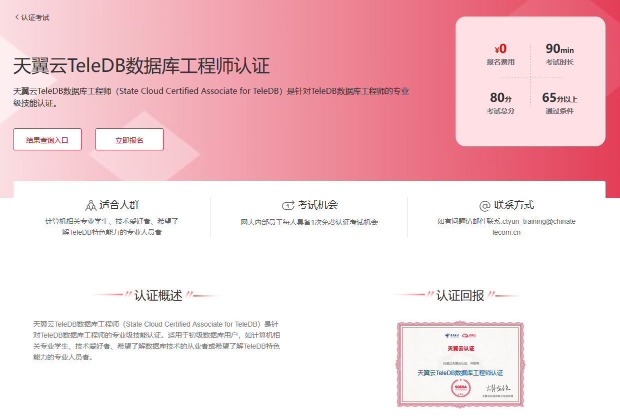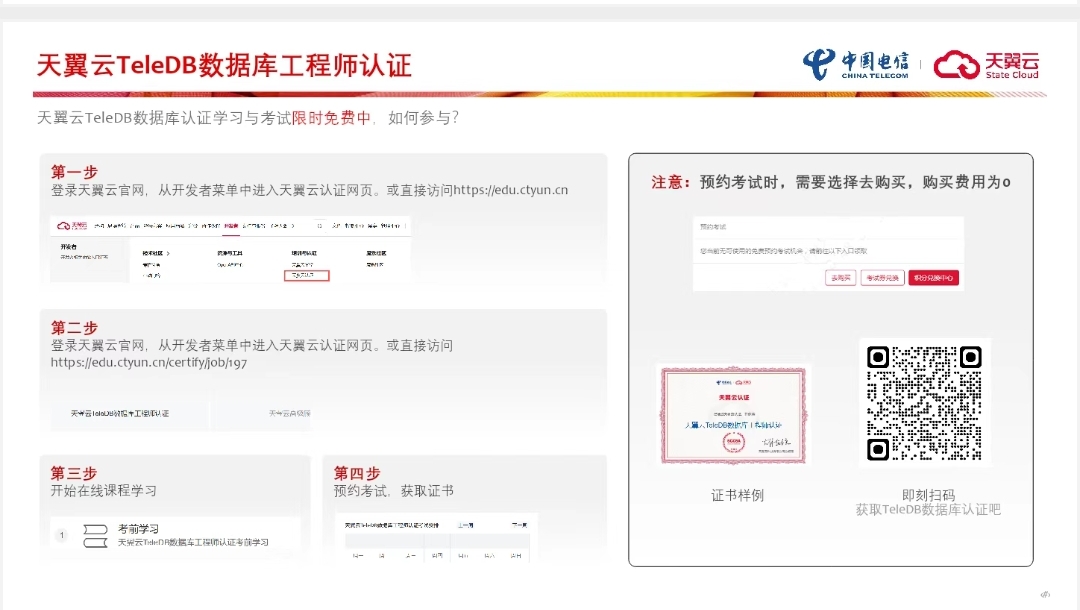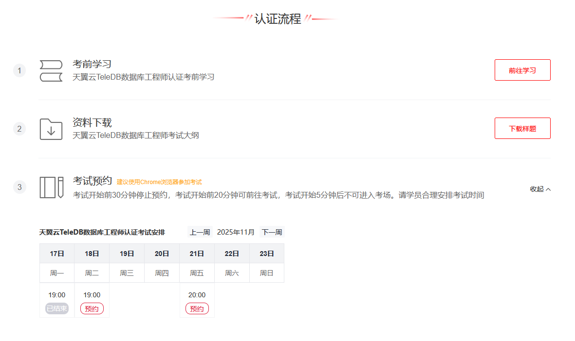 登录成功之后,通过导航栏-统一考试中心-认证考试进入认证页面 进入认证页面向下滑动找到专项认证体系-中级模块-选择天翼云TeleDB数据库工程师认证,或直接导航栏输入天翼云TeleDB数据库工程师认证预约链接 https://edu.ctyun.cn/certify/job/197 进入预约页面
