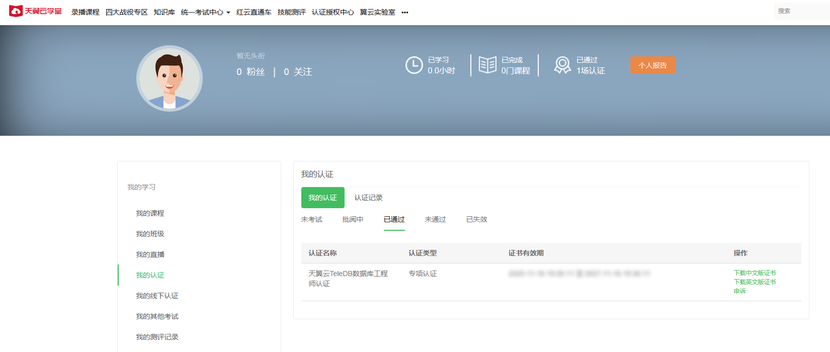 完成考试24小时之后可以查询考试结果,查询路径:个人中心-我的认证-已通过/未通过页面查看。