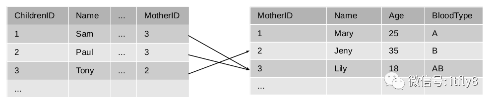 一对多的关系不能只用一个表来保存。为什么?以前面的例子来说,我们一开始可能会考虑建立一个名为Mothers的表,