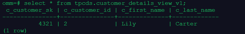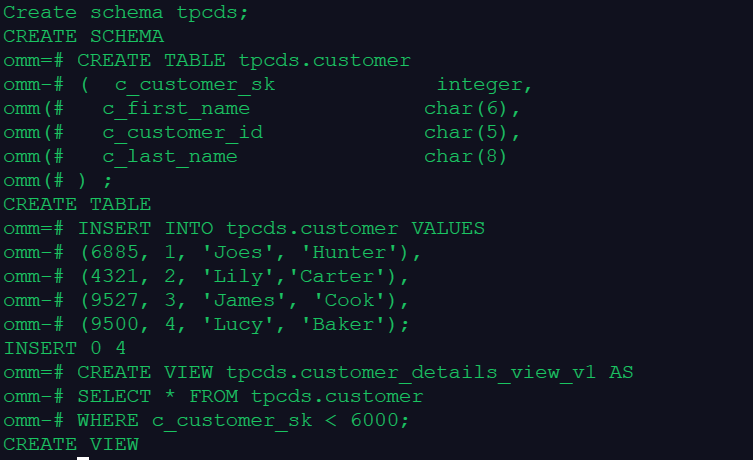 Create schema tpcds; CREATE TABLE tpcds.customer ( c_customer_sk integer, c_customer_id char(5), c_first_name char(6), c_last_name char(8) ) ; INSERT INTO tpcds.customer VALUES (6885, 1, 'Joes', 'Hunter'), (4321, 2, 'Lily','Carter'), (9527, 3, 'James', 'Cook'), (9500, 4, 'Lucy', 'Baker'); CREATE VIEW tpcds.customer_details_view_v1 AS SELECT * FROM tpcds.customer WHERE c_customer_sk < 6000;