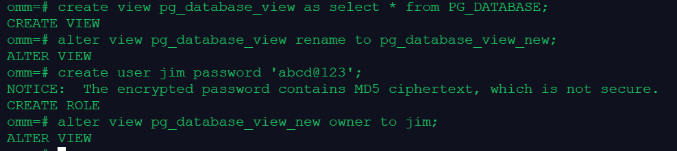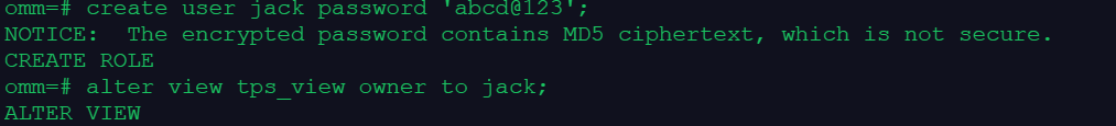 create user jack password 'abcd@123'; alter view tps_view owner to jack;