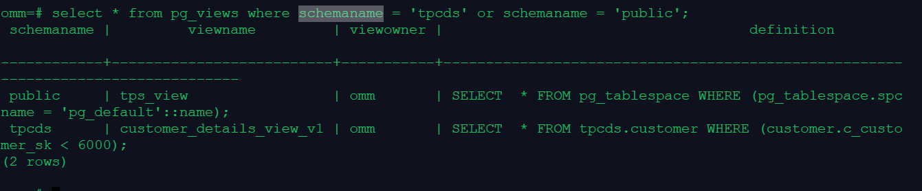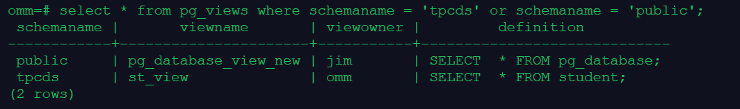 select * from pg_views where schemaname = 'tpcds' or schemaname = 'public';