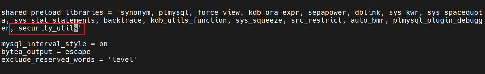 用户权限隔离功能开启需要加载插件 security_utils,在使用 security_utils 之前,我们需要将他添加到 kingbase.conf 文件的 shared_preload_libraries 中,并重启 KingbaseES 数据库:
