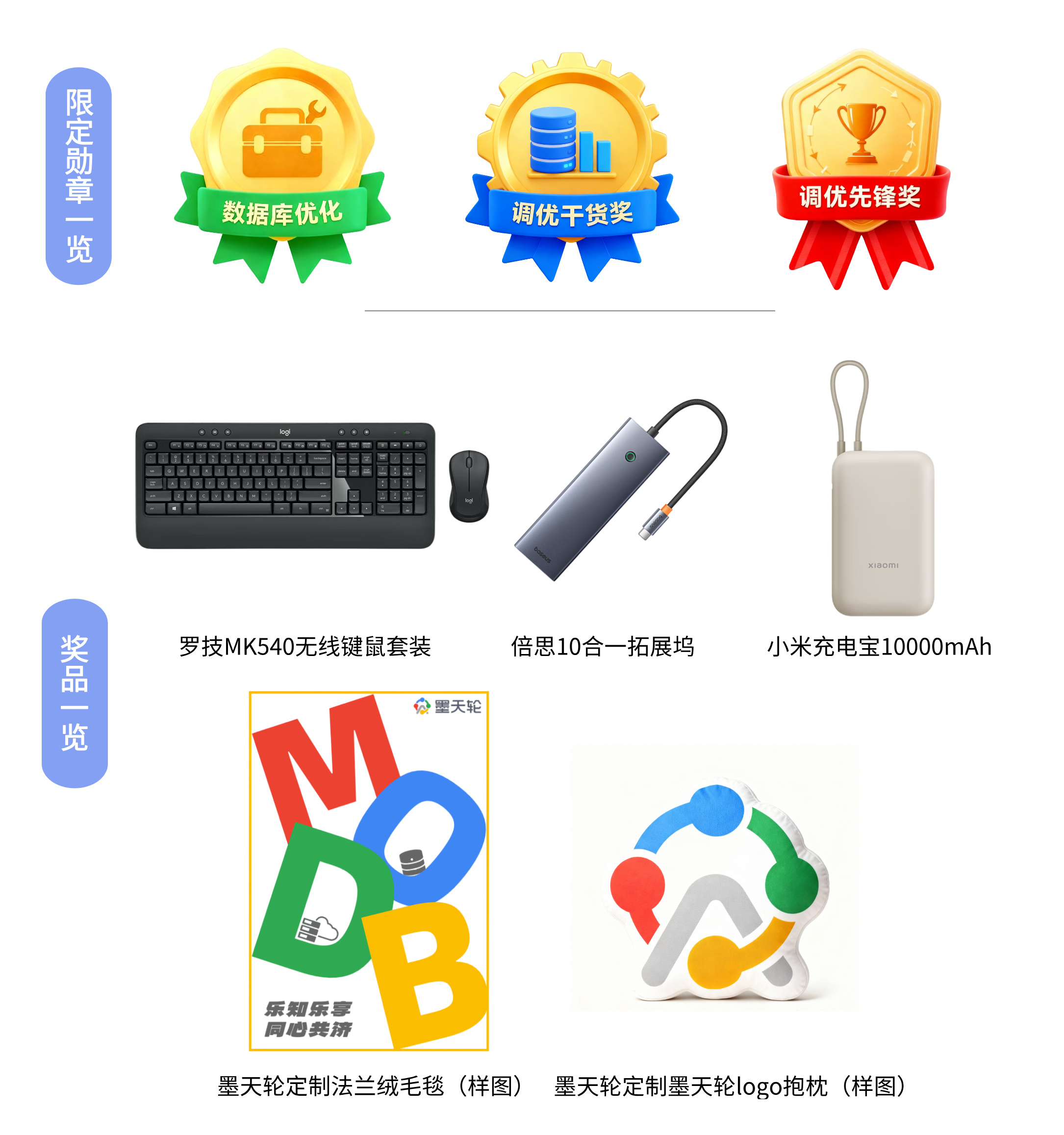| 调优干货奖 | 若干篇 | 调优干货限定勋章(虚拟)+实物奖品(以下奖品可二选一) 1、墨天轮定制法兰绒毛毯 2、墨天轮定制墨天轮logo抱枕 |