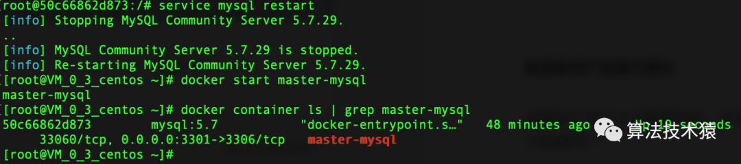 重启完MySQL服务后,master-mysql容器会终止,需要重启master-mysql容器